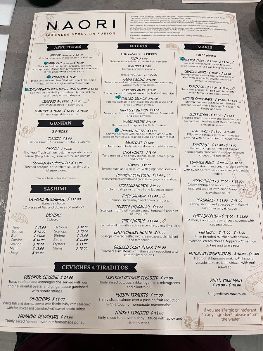 Láminas de pescado marinadas en jugo de limón, estilo clásico peruano. / Thinly sliced fish marinated with lime juice in a classic Peruvian style.