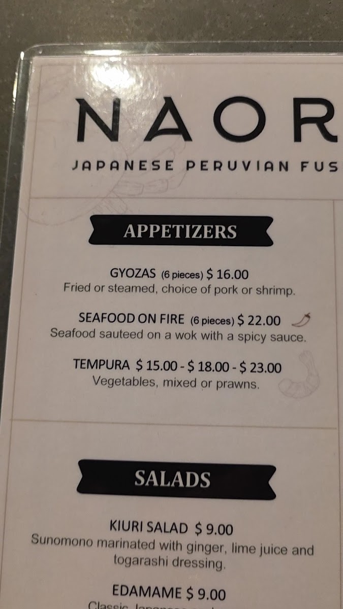 Langostino crocante y palta por dentro. Cangrejo flameado con queso picante y salsa tare por fuera. / Crispy shrimp and avocado filling. Crab flambe with spicy cheese and tare sauce filled crispy shrimp and avocado with torched crab and spicy cheese served with a tare sauce.
