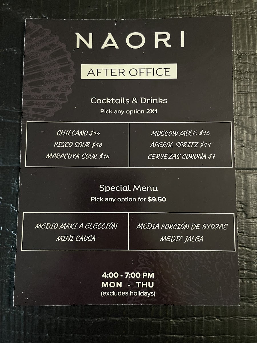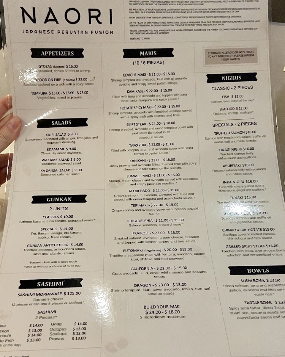 Bañado en salsa tiradito, salsa de ajos, kión y cebolla china. Especiales de 2 unidades. / Hamachi on a tiradito sauce with garlic sauce, ginger and scallions. Special, 2 units.