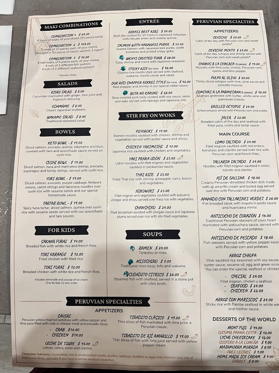 Cubos de salmón, atún y langostinos marinados, hilos de nabo, espárragos, palta y kiuri todo montado sobre shari. / Diced salmon, tuna and marinated shrimp, daikon, asparagus, avocado and kiuri served with sushi rice.